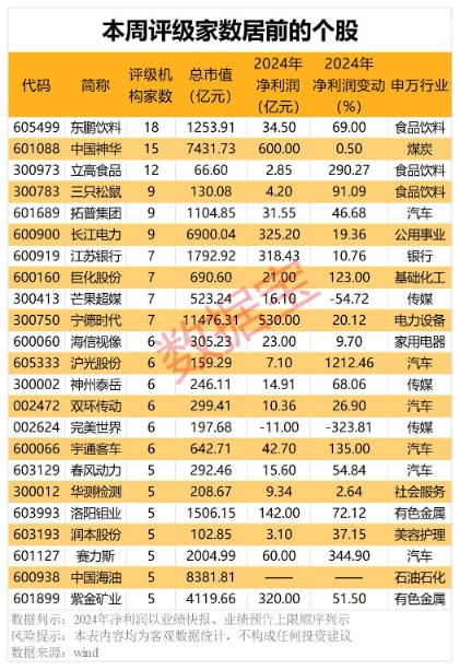 机构关注度最高的是东鹏饮料,有18家机构评级;紧随其后的是中国神华,有15家机构评级。合计来看,共86股获2家及以上机构重点关注。