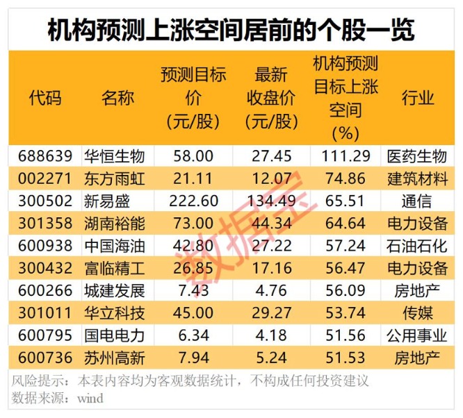本周机构评级的个股中,10股最新收盘价较机构预测目标价上涨空间超50%,其中华恒生物上涨空间超110%。